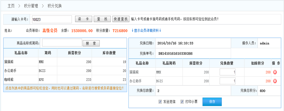 1.發(fā)送短信:如果系統(tǒng)開啟了短信功能,在完成兌換后系統(tǒng)會自動給該會員發(fā)送通知短信,告知會員兌換信息?。ㄩ_啟短信功能在 增值服務(wù)》服務(wù)參數(shù)》短信參數(shù)設(shè)置(對短信進行參數(shù)設(shè)置))