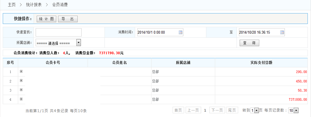 2.會(huì)員消費(fèi)統(tǒng)計(jì):將統(tǒng)計(jì)在滿足設(shè)定的條件下的所有消費(fèi)的概況